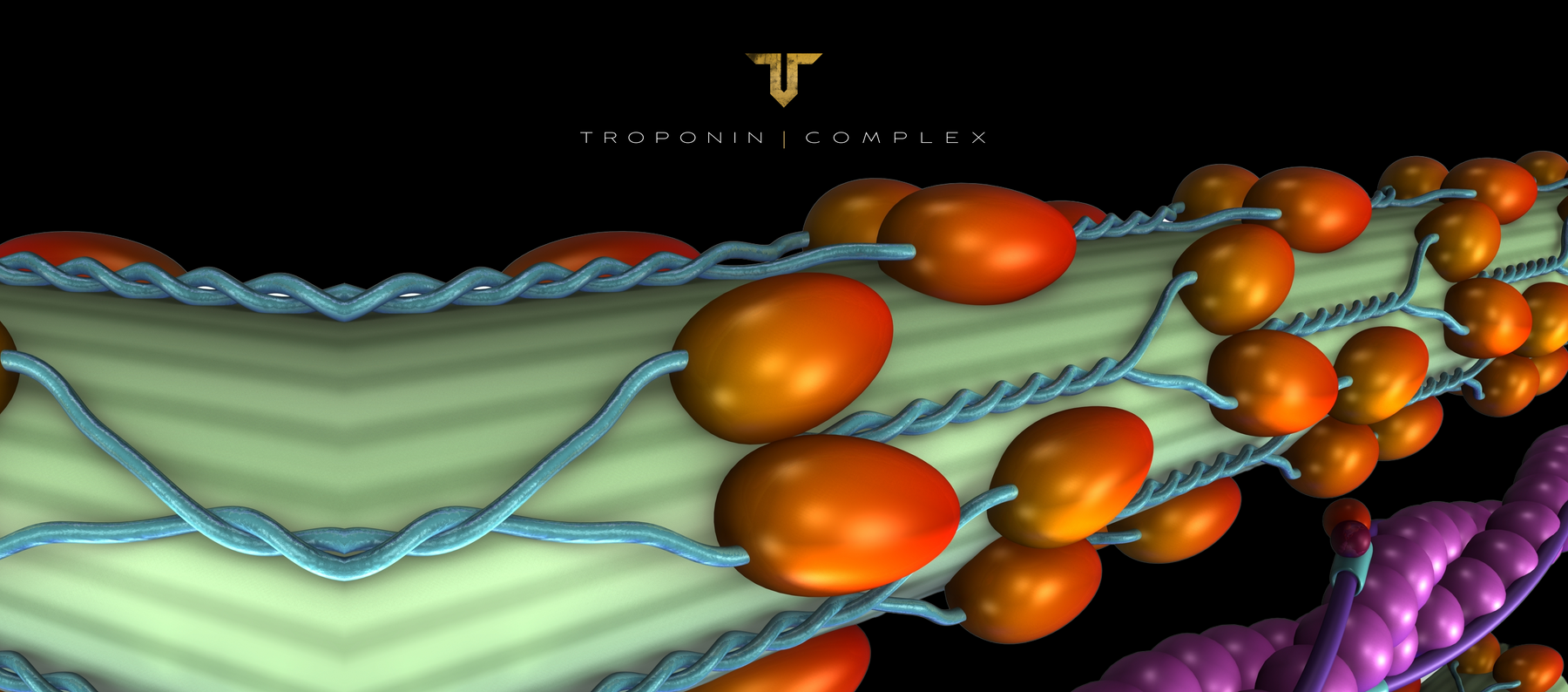 Troponin (tro-po'-nin) is a complex of proteins that is integral to muscle contraction. Troponin is attached to tropomyosin (another type of protein) and lies within the groove between actin (muscle) filaments. When the muscle cell is stimulated to contract, mechanisms cause the concentration of calcium in the sarcoplasm to rise, causing a conformational change that moves troponin and tropomyosin out of the way so that the cross bridges can attach to actin and produce muscle contraction. Without troponin, there can be no muscular contraction.